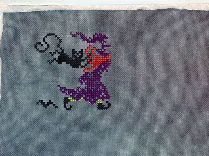 I'm also using some Silk'n Colors in place of DMC; the broom bristles were stitched with one color, and the leaves with another. It's nice to get a lot of variegation without having to change colors all the time.